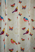 De naam van dit gordijn zegt het al: Pajaros betekent in het Spaans ‘vogels’. Vrolijke vogels zijn afgebeeld op matte, ecru kleurige stof. Ook zomerse vlinders vliegen vrolijk rond. De vogels zijn 15 cm groot en de vlinders 8 cm. Op de ondergrond zijn subtiel in zandkleur vogelkooitjes gedrukt. Doordat de stof niet al te zwaar geweven is, is het patroon aan de achterzijde ook aardig zichtbaar. Wil je graag donker slapen, dan kun je dit gordijn prima laten voeren. De stof is kamerhoog, waardoor je het voor dezelfde prijs kamerhoog kunt laten maken. Kies jij voor deze zomerse natuur sfeer?