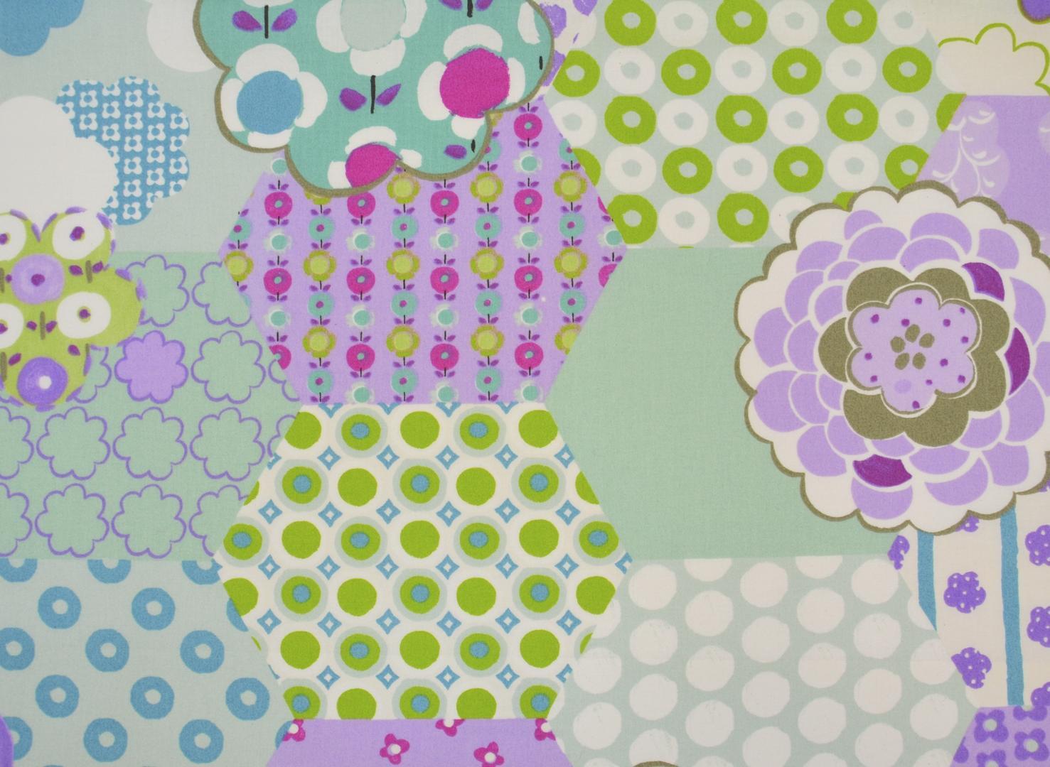 De kleuren zijn licht, vrolijk en zacht tegelijk. De basis bestaat uit pastelachtige tinten zoals lila, lichtroze, zacht paars en crème. Daarin zijn frisse accenten verwerkt in turquoise, zacht blauw, geel en lichtgroen. De bloemen en cirkels brengen extra diepte door het gebruik van meerdere tinten binnen één vorm. Deze combinatie maakt het gordijn geschikt voor zowel een babykamer als een meisjeskamer waarin warmte en kleur gewenst zijn.
