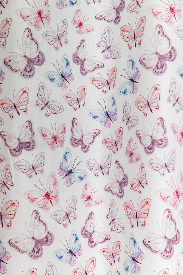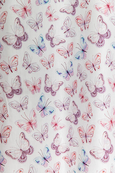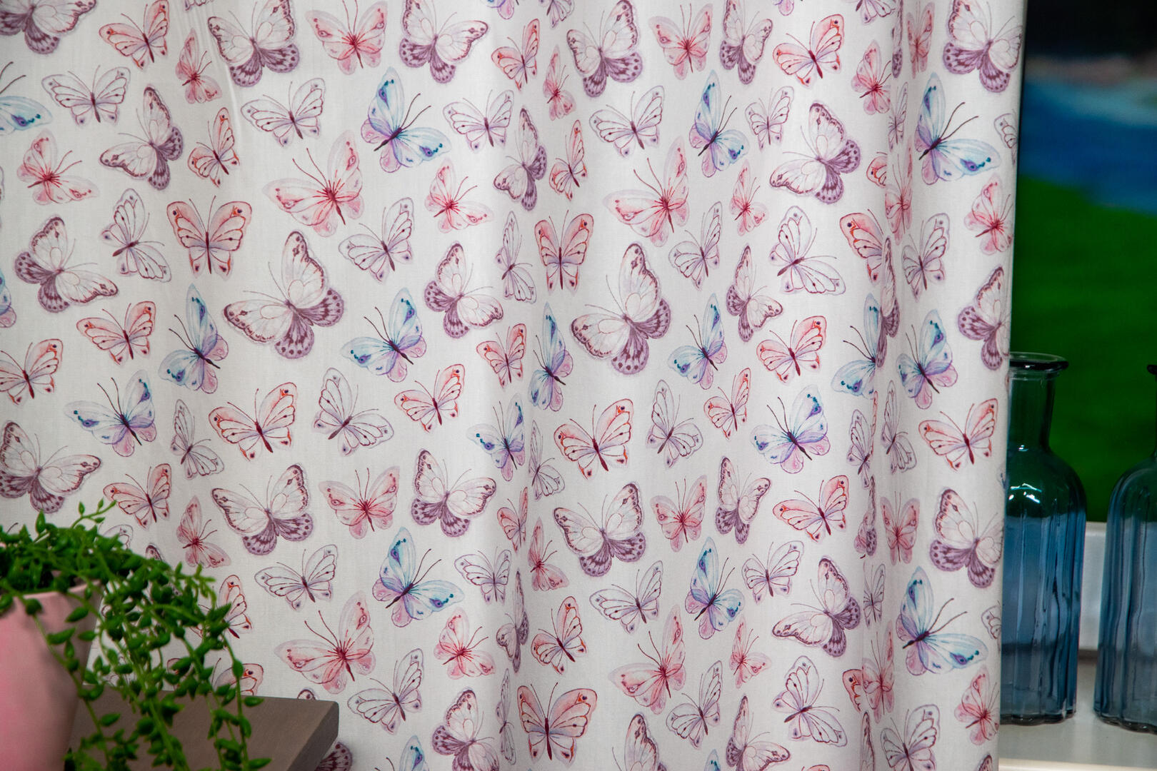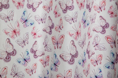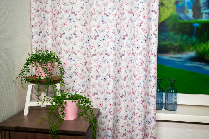 Vlinder, vlinder zoek me dan. Vliegen zó luchtig en sierlijk, ik kan daar wat van. Een vlinder verrast en streelt het oog, wat bijzonder om dat op een gordijn te ‘vangen’. Kunstzinnig en een ideale inspiratiebron voor een prachtig kindergordijn. De stof heeft een fris witte ondergrond bedrukt met pastel kleurige vlinders. De stof is heel mooi glad geweven en heeft haast een luchtige satijn uitstraling. Het gordijn komt daardoor prettig fris en tijdloos over. Ook leuk om een pasteltintje op de muur te schilderen, voor een extra sprankelend effect.