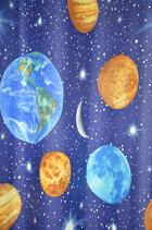 Het HEELAL op je slaapkamer, dat is pas slapen onder een sterrenhemel! Jupiter, Mars en onze planeet Aarde, hier 30 cm groot. De mooie zware bedrukte stof is kamerhoog en kan dus voor dezelfde prijs tot de grond gemaakt worden! De meterprijs is n.l. 280 cm hoog, zo komt ons zonnestelsel extra mooi uit op jouw slaapkamer. Voor extra verduistering kan het gordijn gevoerd worden.