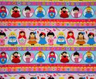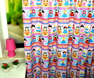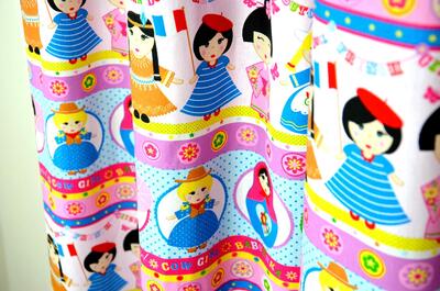 Kleurrijk kindergordijn waarop meisjes uit allerlei verschillende culturen zich verzamelen. Een indianenmeisje naast een melkmeisje en een matroesjka naast een flamenco danseres. Leuk gordijn voor reislustige kinderen.