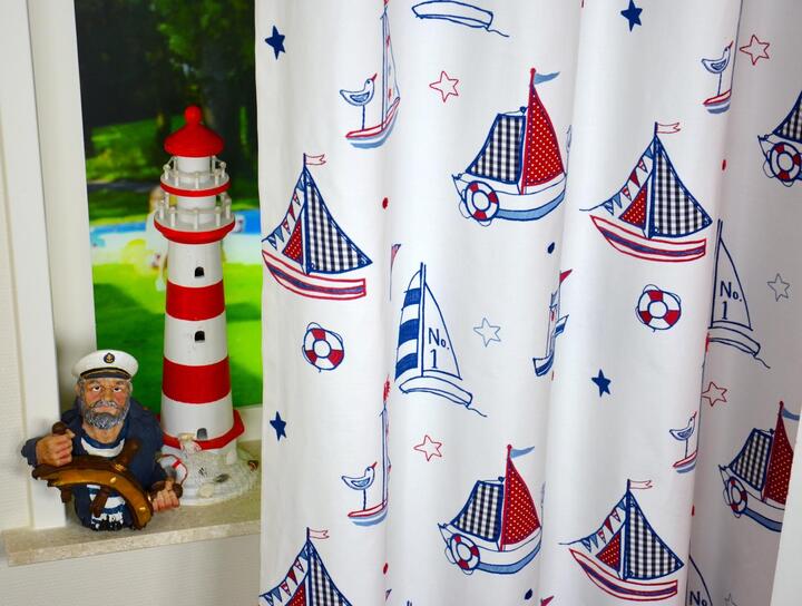 Het gordijn Happy Boy brengt een vrolijk maritiem thema in de kinderkamer met een patroon vol zeilboten, reddingsboeien, sterretjes en kleine vlaggetjes die speels over de stof zijn verdeeld. Op de foto’s zie je hoe elk bootje niet alleen is geborduurd, maar ook is opgebouwd uit echte, ingenaaide printstofjes: ruitjes, stippen en fijne weefsels vormen samen de zeilen, terwijl de rompen en details met een stevige borduursteek zijn omlijnd. Dat geeft een voelbare diepte en een ambachtelijke uitstraling die je direct ziet én voelt wanneer je de stof in handen hebt.