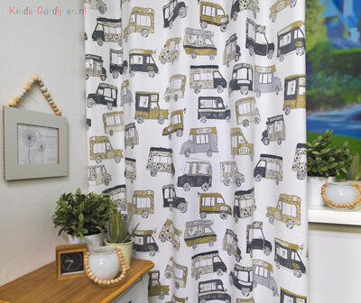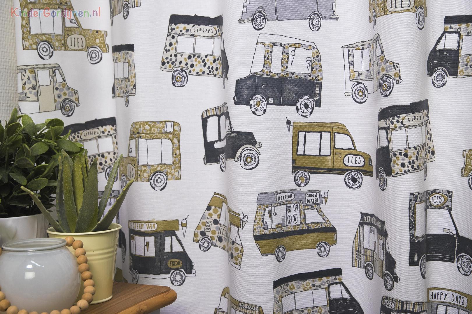 Een autootjes gordijn, maar niet zo maar auto’s: het zijn héérlijke klassieke ijscowagens! De bel klinkt, de ijscoman rijdt door de straat. Daar word je toch vrolijk van? De wagentjes zijn 10 cm groot en gedrukt op stevig geweven, matte katoen. De ondergrondkleur is fraai kiezelgrijs, de gebruikte tinten mooi poederig van kleur. Dat geeft nog even extra dat nostalgische effect. De wafelijsjes en hoorntjes zijn op jouw slaapkamer natuurlijk ‘ijskoude dé beste!’
