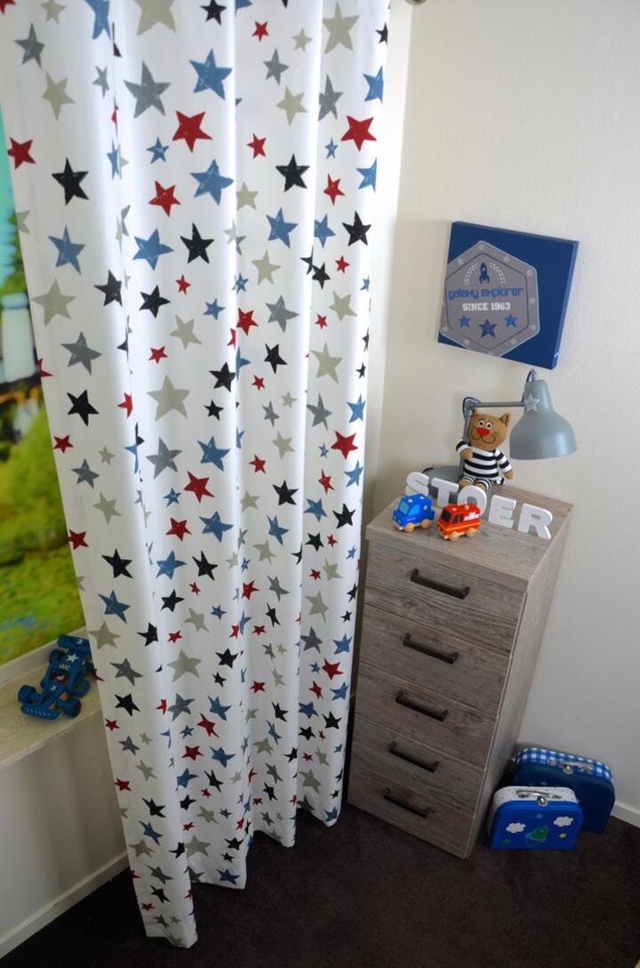 Deze sterren gordijnen zijn ideaal omdat ze kleurrijk én tijdloos zijn. Ook leverbaar in 5 verschillende kleurpaletten, waardoor zij voor zowel jongens- als meisjeskamer geschikt zijn. Jong & oud zou toch graag eens onder een sterrenhemel slapen? Daarom is het zo leuk om dit thema uit te breiden. De gordijnstof kan ook als vouwgordijn gemaakt worden en naar wens gevoerd. Welterusten sterretjes!