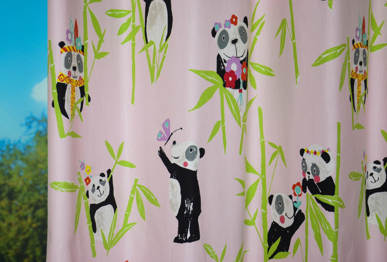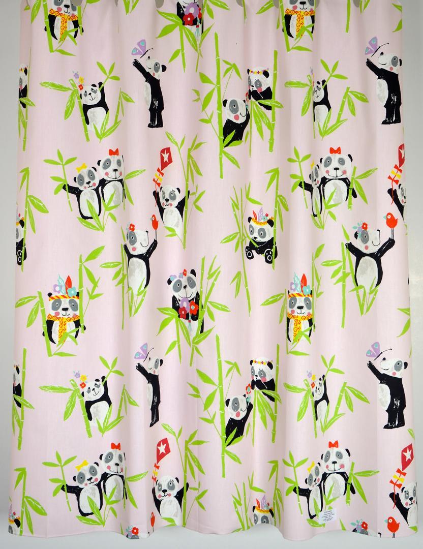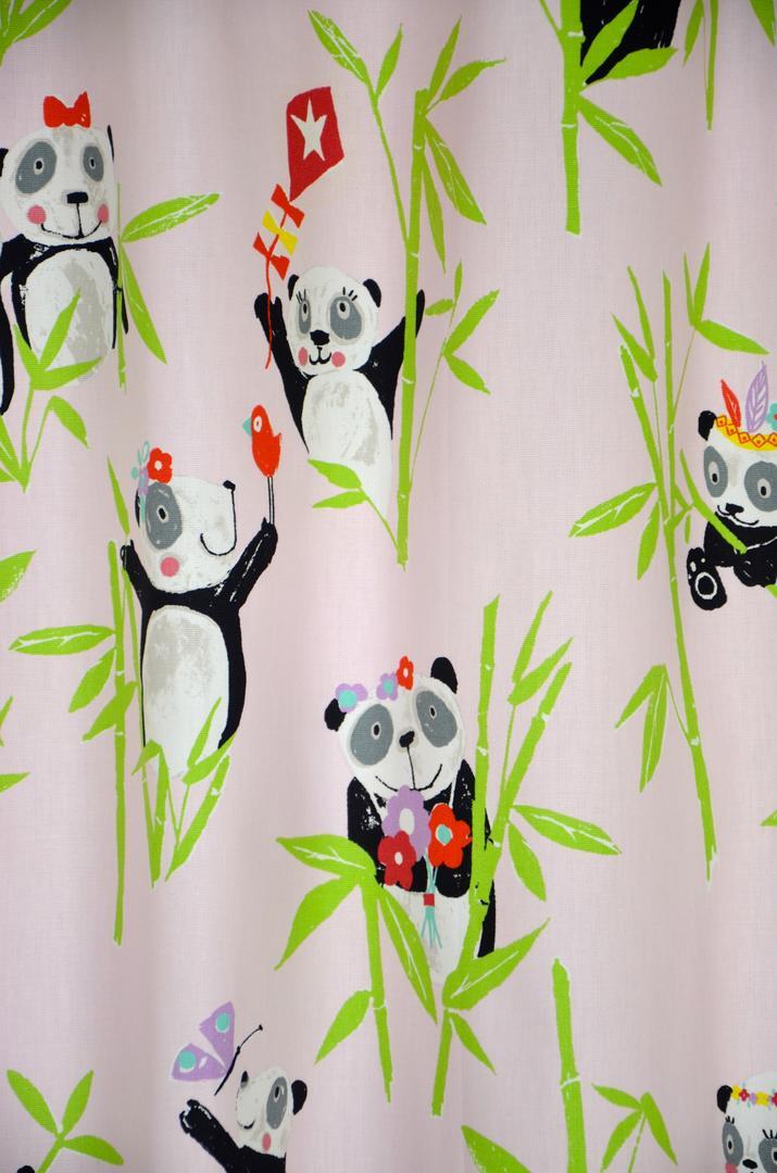 AhhhÂ… om te smelten, wat een schattige reuzenpanda’s! In het wild leven pandaberen alleen in Azië. China om precies te zijn en daar eten zij de hele dag door verse bamboeblaadjes. Ze hebben een dikke vacht omdat de winter in de Chinese bergen erg koud is. Gelukkig heb jij vast een héérlijk warme slaapkamer voor deze berenfamilie. De panda’s zijn zo’n 14 cm groot. De gordijnstof is leverbaar in 3 frisse kleuren en kan naar wens gevoerd worden.