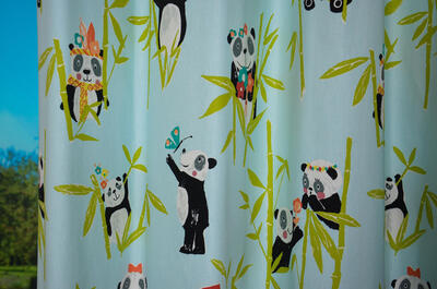 AhhhÂ… om te smelten, wat een schattige reuzenpanda’s! In het wild leven pandaberen alleen in Azië. China om precies te zijn en daar eten zij de hele dag door verse bamboeblaadjes. Ze hebben een dikke vacht omdat de winter in de Chinese bergen erg koud is. Gelukkig heb jij vast een héérlijk warme slaapkamer voor deze berenfamilie. De panda’s zijn zo’n 14 cm groot. De gordijnstof is leverbaar in 3 frisse kleuren en kan naar wens gevoerd worden.