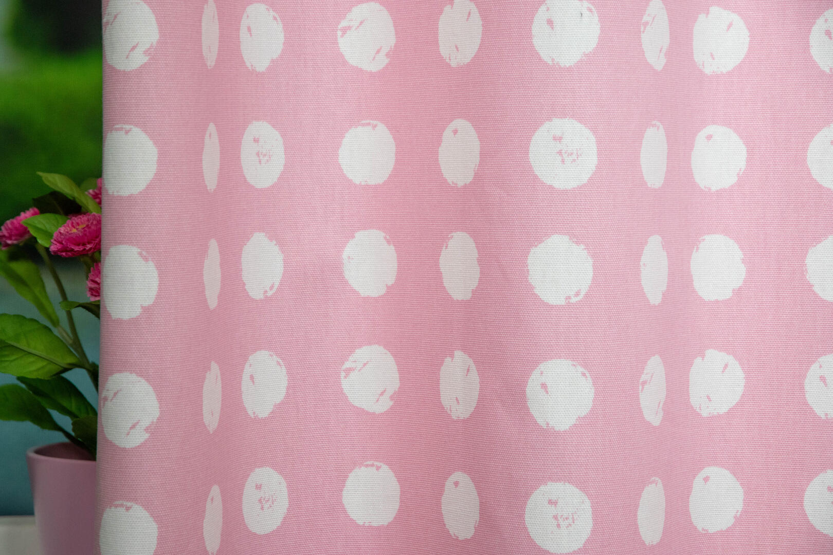 Het stippengordijn Zero is een hoogwaardige gordijnstof verkrijgbaar in 8 kleuren. Dit gordijn is gemaakt van een zware kwaliteit stof, waardoor het niet alleen een prachtige uitstraling heeft, maar ook duurzaam en stevig is. Wat dit gordijn zo bijzonder maakt, zijn de 3 cm grote witte stippen die als gestempeld lijken op de stof. Deze stippen zijn perfect geplaatst, netjes en eenvoudig in een rij op de stof. Het resultaat is een speels en trendy patroon dat een moderne touch geeft aan de kinderkamer.
