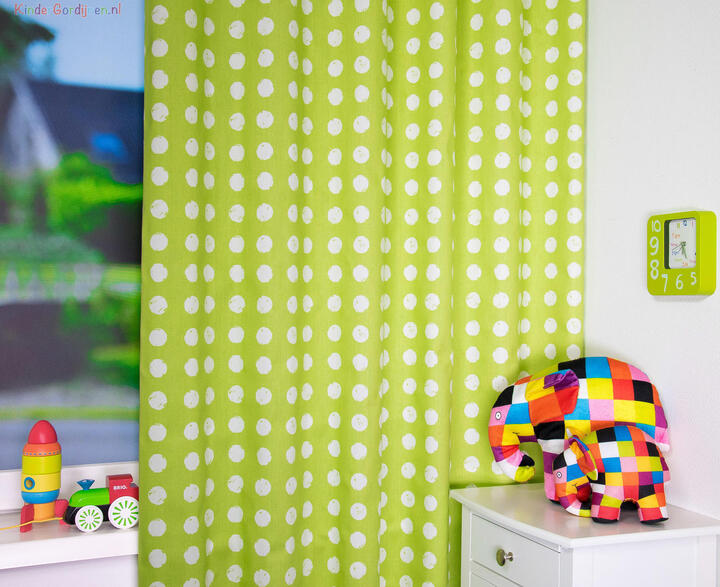 Het stippengordijn Zero is een hoogwaardige gordijnstof verkrijgbaar in 8 kleuren. Dit gordijn is gemaakt van een zware kwaliteit stof, waardoor het niet alleen een prachtige uitstraling heeft, maar ook duurzaam en stevig is. Wat dit gordijn zo bijzonder maakt, zijn de 3 cm grote witte stippen die als gestempeld lijken op de stof. Deze stippen zijn perfect geplaatst, netjes en eenvoudig in een rij op de stof. Het resultaat is een speels en trendy patroon dat een moderne touch geeft aan de kinderkamer.