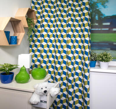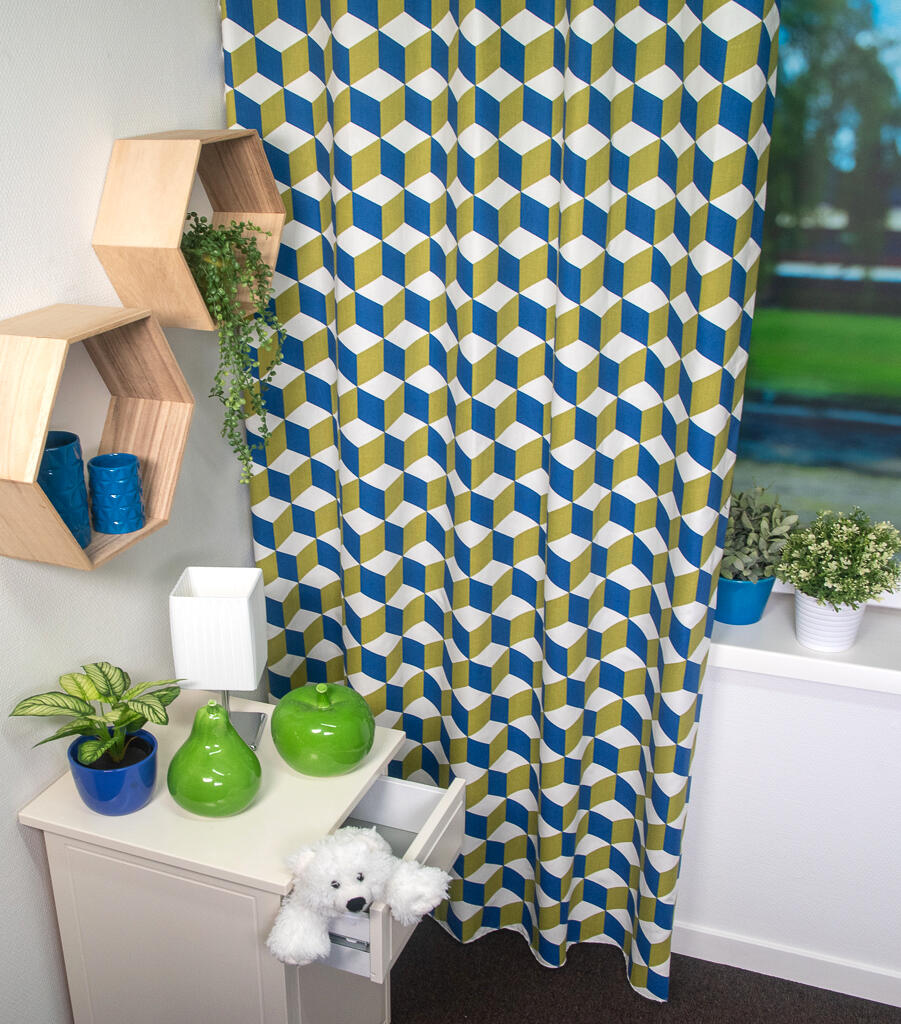 Cube Kindergordijn, dat is de naam van dit mooie gordijn. Het is een kindergordijn met allemaal vierkantjes (cubes) en het lijkt in de eeuwigheid door te gaan. Door de mooie kleuren van oranje en blauw en het rustige wit komt het kindergordijn helemaal tot leven. Het kindergordijn is gemaakt van 100% katoen hierdoor is het heerlijk soepel en zacht en kan je ook dit kindergordijn laten verduisteren zodat je in één keer klaar bent met het gordijn. Je kind kan nu heerlijk slapen in een donkere kamer. Maar als je het kindergordijn eerst wil zien en voelen dan bestel je een knipstaal en dan kun je het met eigen ogen zien. Dit is een tip van Jelmer! Hou jij ook zo van die wiskundige figuren?