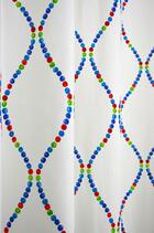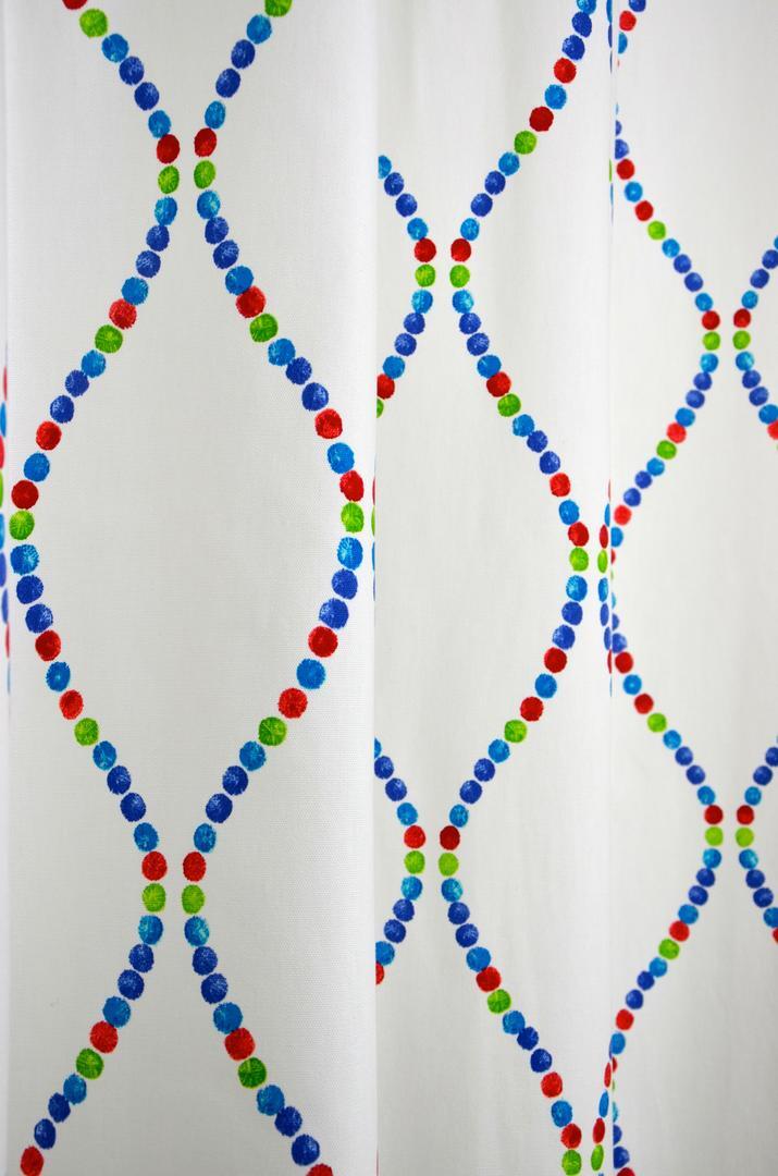 Wat een kleurrijk gordijn met deze tijdloze grafische vorm. Door die rustige, herhalende golven is deze stof zeer geschikt om tot de grond te laten maken. Het geeft zelfs ‘voor het oog’ wat extra hoogte aan de kamer! De ondergrond waarop de stipjes gedrukt zijn is gemaakt van een ietwat ruw geweven, sportieve katoen. De afstand tussen de glooiende golven is 16 cm. Leverbaar in twee verschillende kleur paletten, waardoor geschikt voor iedere kinderkamer.