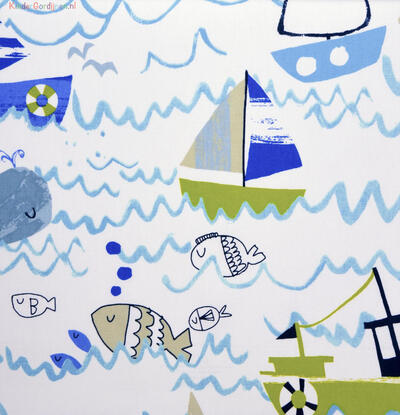 Een fraai maritiem gordijn, leverbaar in 2 kleuren. De lekker robuust geweven stof is warm wit van kleur en aan de voorzijde bedrukt met grafisch vormgegeven bootjes en visjes. De blauwe variant heeft diep steenrood als accentkleur. De aqua blauwe variant is lichter en fris van kleur en heeft lindegroen als accentkleur. De bootjes zijn +/- 15 cm groot. Het is natuurlijk super leuk om dit thema met accessoires uit te breiden en evt. een accent blauwe of groene wand. De kwalitatief hoogwaardige stof valt soepel en kan desgewenst nog gevoerd worden. Zie jij de nieuwe kamer al voor je?