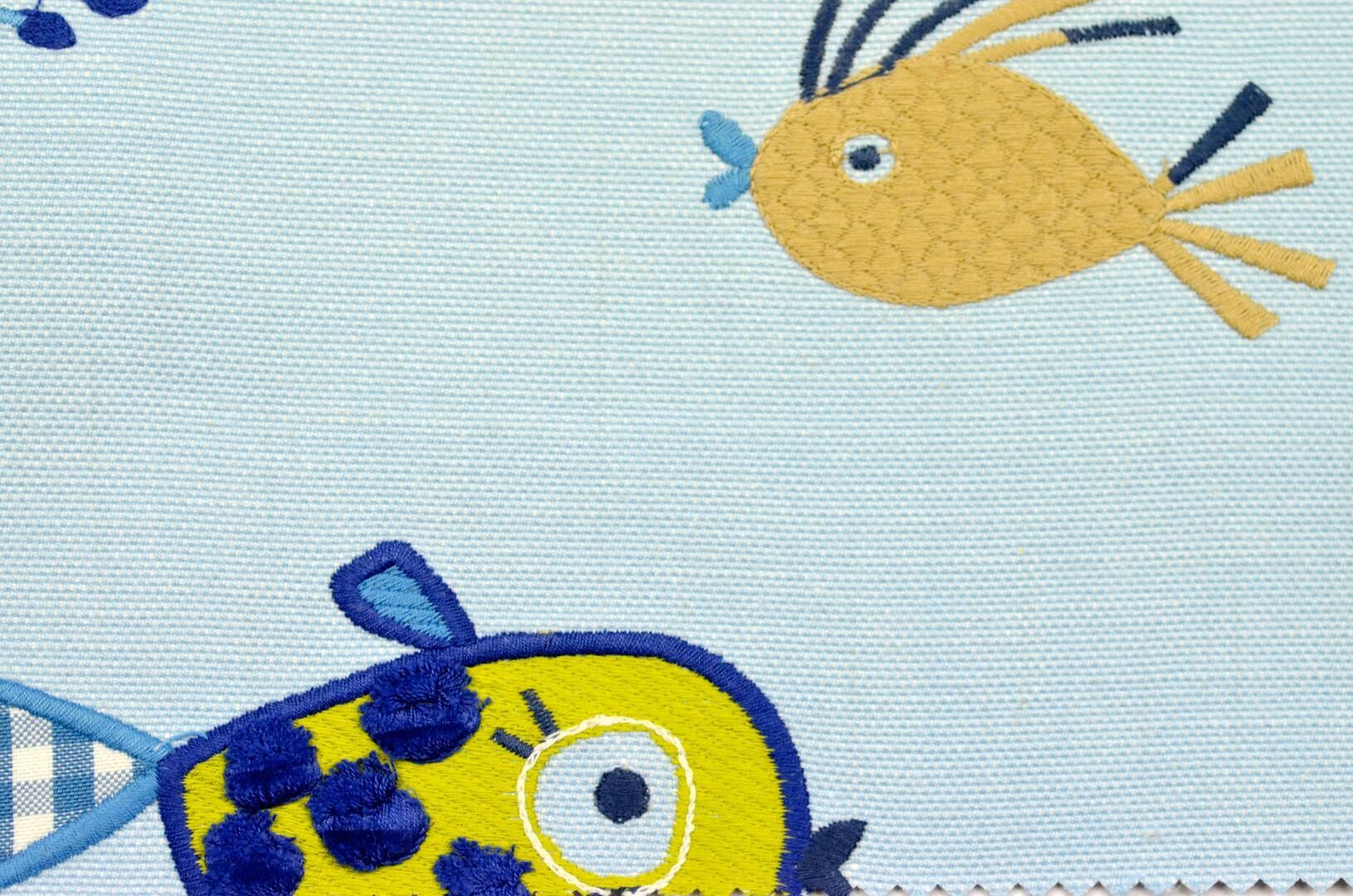 Het gordijn Tiddlers brengt een levendig zee-thema in huis met een patroon dat direct opvalt door de combinatie van borduurwerk en echte stukjes stof die in de figuren zijn verwerkt. Op de lichte, mat geweven katoenondergrond – met een zachte, iets geribde linnenstructuur – zwemmen vrolijke visjes, inktvisjes en andere zeediertjes in tinten blauw, rood, zand en crème. Sommige vissen hebben staarten van ruitjes- of streepstof, terwijl andere zijn gevuld met kleine lapjes die extra diepte geven. In de details zie je hoe zorgvuldig alles is opgebouwd: het grotere visje met de geborduurde schubben is afgewerkt met kleine, zachte kwastjes op zijn lijfje, wat het geheel een speels en bijna aaibaar karakter geeft.