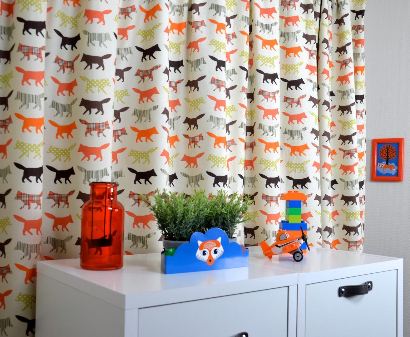 Mooie kindergordijnen met stoeren wolfen, ieder ingekleurd met hun eigen patroon. De gordijnstof is verkrijgbaar in twee kleurenvarianten waarbij de motieven nauw op elkaar zijn afgestemd. Samen zorgen ze voor een levendige combinatie.