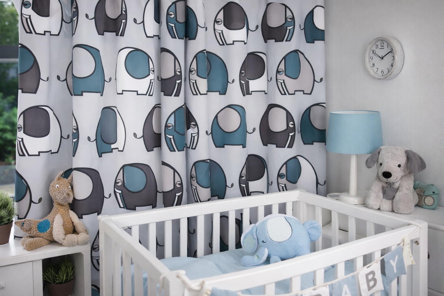 De basis van de stof is zacht grijs, waardoor de kleuren extra fris naar voren komen. Het motief bestaat uit een uitgebalanceerde combinatie van petrolblauw, grijsgroen, taupe en warm grijs, afgewisseld met witte vlakken. Deze tinten sluiten perfect aan bij moderne kinder- en babykamers, maar passen ook verrassend goed in een strak of Scandinavisch interieur. De dunne donkergrijze contourlijnen geven de olifanten een duidelijke vorm zonder hard te ogen.