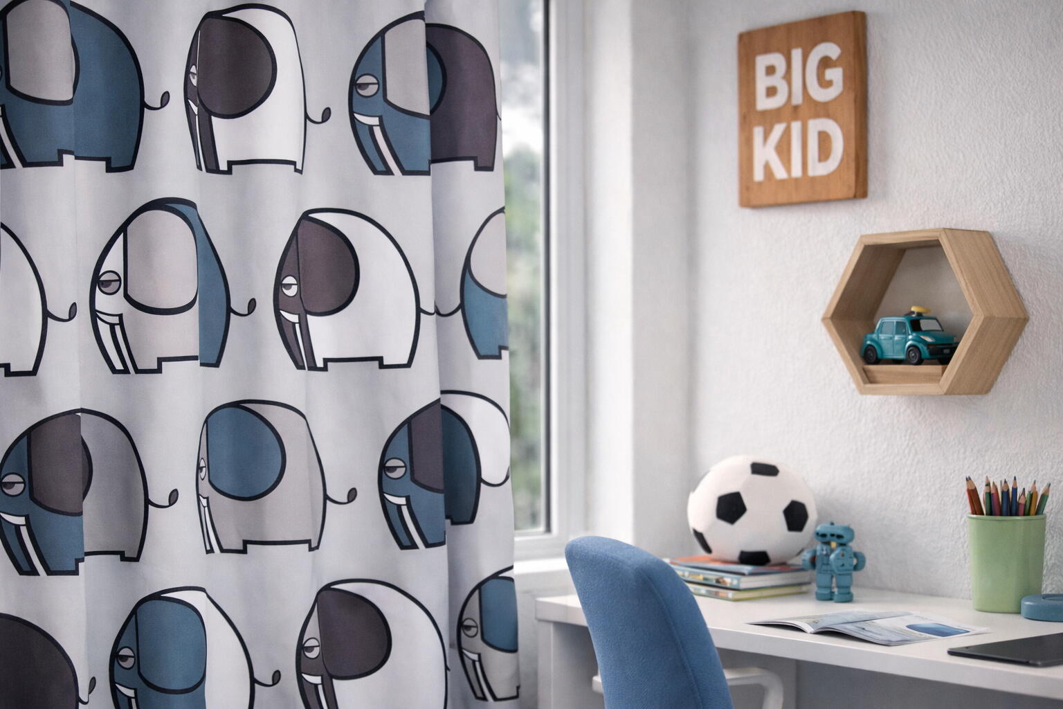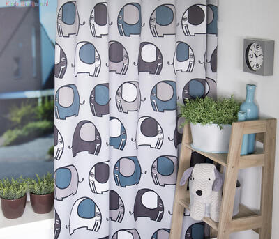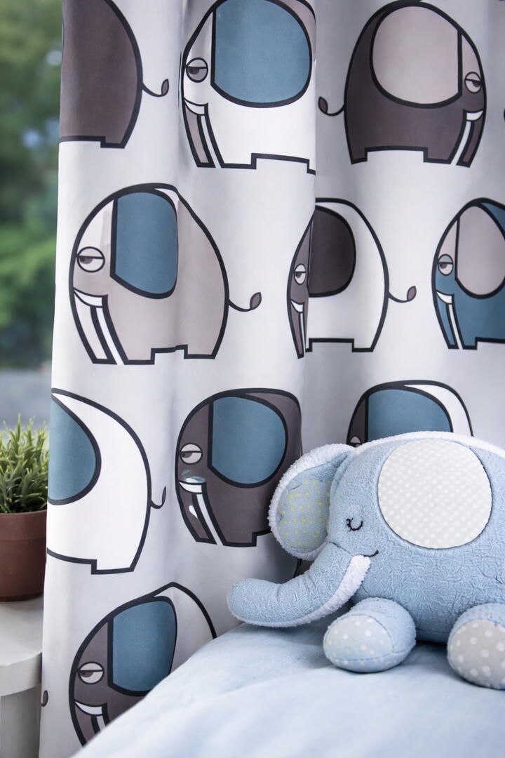 Ronbo is een gordijn dat meteen in het oog springt door zijn vrolijke, grafische olifantenmotief. De figuren hebben een formaat van ongeveer 15 cm en zijn strak getekend met zachte afgeronde vormen, waardoor het dessin rustig blijft ondanks het levendige patroon. De olifanten staan in verschillende richtingen en kleuren, wat een dynamisch maar harmonieus geheel oplevert.