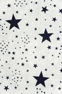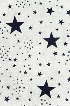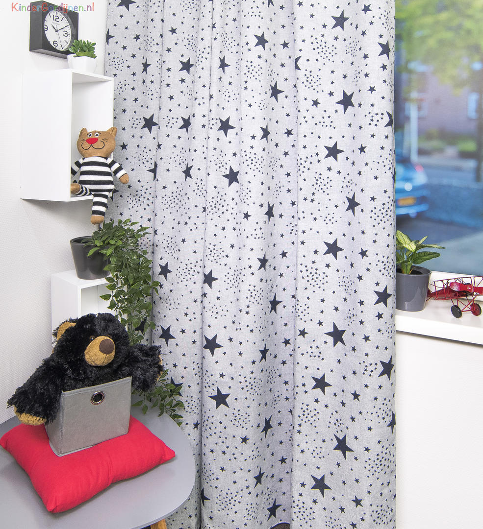 Fonkelende kamerhoge gordijnen met marineblauw of donkerrode sterren van verschillend formaat op een ietwat grijze ondergrond.
