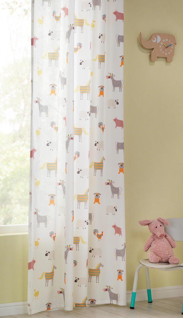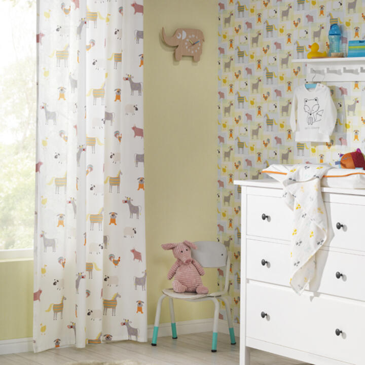SCHATTIG! Nostalgisch getekende boerderijdieren zijn afgebeeld op dit gordijn. De stof is soepelvallend en in satijnlook fijn geweven. Het gordijn is leverbaar in 2 verschillende kleurpaletten, beide geschikt voor zowel de jongens- als meisjeskamer. De koe is b.v. 10 cm groot, het gansje 7 cm. Krijg jij een kindje en je weet niet wat “het” gaat worden, dan is dit een uitstekende keuze. Stippen behang op 1 wand is een leuke combi, al dan niet met een subtiel glansje erop. Voor verduistering graag optie voeren in het bestelproces aanvinken