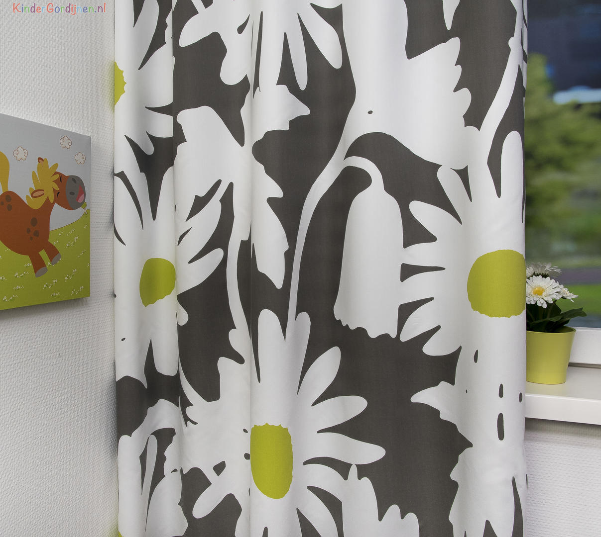 Het kindergordijn Salvi is een prachtige keuze voor de kinderkamer. Op dit gordijn staan grote witte bloemen met een geelgroene kern, geplaatst op een achtergrond in zwart en grijs. Deze opstelling zorgt ervoor dat de bloemen goed tot hun recht komen en een levendig en vrolijk gevoel creëren in de ruimte. Het materiaal dat gebruikt is voor het Salvi kindergordijn bestaat uit 70% polyester en 30% katoen. Dit zorgt ervoor dat het gordijn soepel valt en een mooie uitstraling heeft.