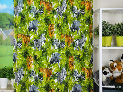 GRRR . TIJGERGORDIJNEN! En niet alleen tijger, want dierenprints zijn HOT! Zebra en neushoorn laten zich ook zien. Het patroon is gedrukt op matte, ietwat geribde stof. De tijger is 15 cm groot en kijkt uitdagend jouw kamer in. Durf jij het aan? De stof is voorradig, dus snelle levering gegarandeerd! Een extra kussen van deze stof maakt het thema natuurlijk compleet. Voor verduistering even laten voeren.