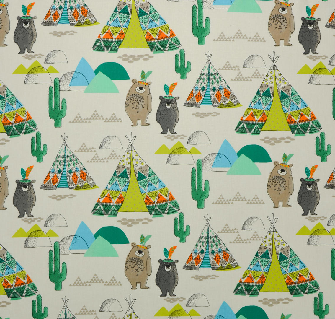 De naam van dit gordijn verklapt het al: Een indianentent! Een tipi tent werd vroeger van canvas of huiden gemaakt. Tegenwoordig associëren wij de naam vooral met de leuke kegelvorm. Natúúrlijk kunnen daar gezellige indiaantjes in komen wonen! De stof is leverbaar in 2 kleuren. De afbeeldingen zijn gedrukt op fijn geweven, matte katoen. Deze is gebroken wit van kleur. De tipi is 17 cm hoog. Voor extra verduistering even laten voeren. Maak jij er met veren een indianenkamer van?