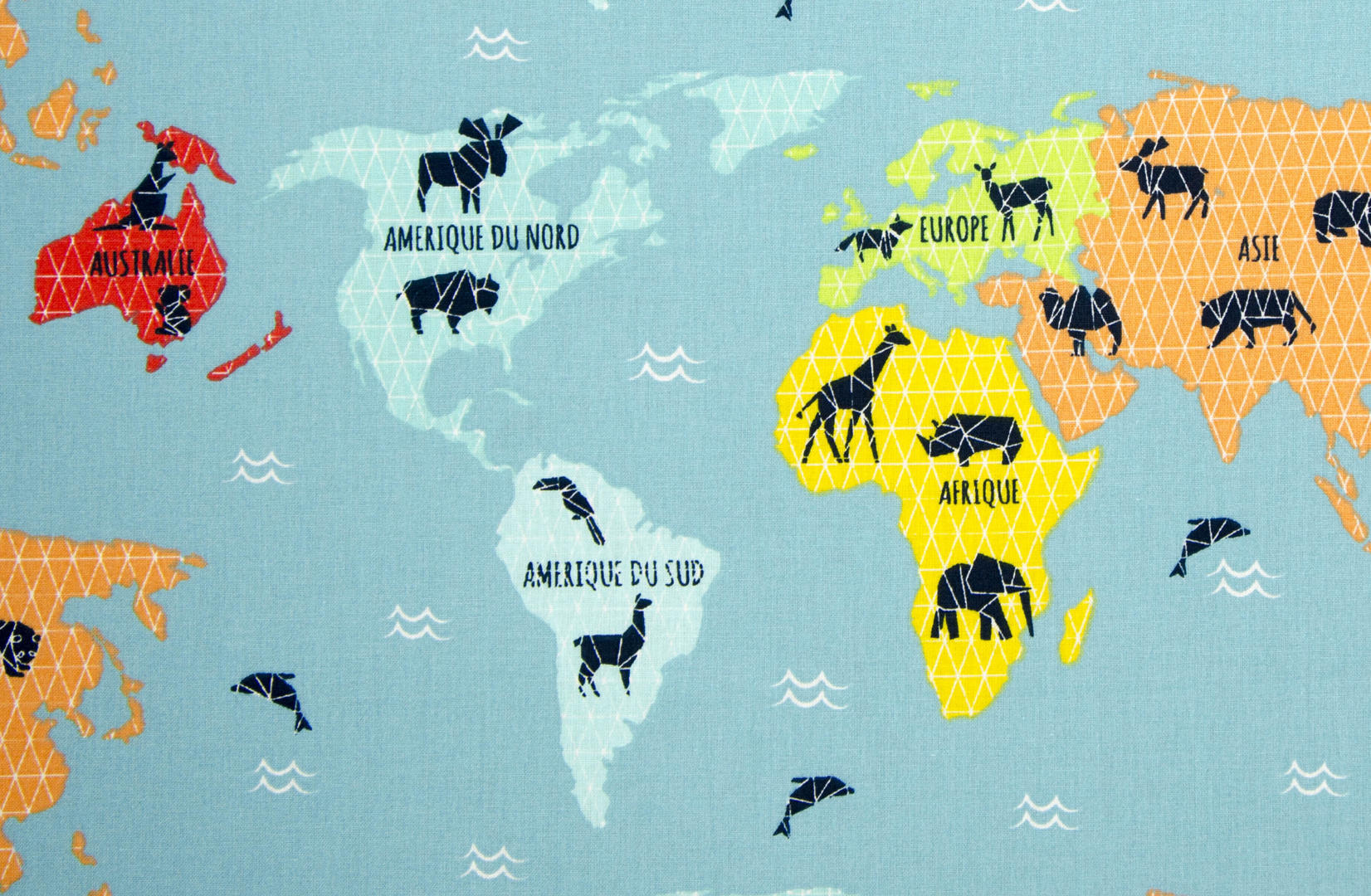 Een wereldkaartgordijn, hoe stoer is dat?! Op soepelvallende, matte katoenen stof is op de voorzijde de plattegrond van de wereld gedrukt. In zachte, rustige, vergrijsde tinten zie je duidelijk de landen en oceanen en hun ligging. Een ontzettend leuk & leerzaam gordijn want vanuit je bed kan je over verre reizen fantaseren. De stof is leverbaar in 2 kleurvariaties: een camelgrijze ondergrond of een lichte petrolkleurige ondergrond. Op de landen en werelddelen staan verschillende vrolijke dieren afgebeeld die je aan kunt treffen. Voor kleurbehoud van dit gave gordijn en eventueel verduistering, kun je de optie voeren aanvinken in het bestelproces. Word jij onze toekomstige globetrotter?