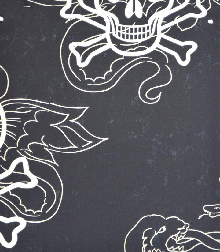 Zwart piratengordijn met skulls en bones. De gordijnstof is samengesteld uit stevig katoen en kan door ons worden verwerkt tot een kant-en-klaar overgordijn. Geschikt voor zowel jongens als meisjes.
