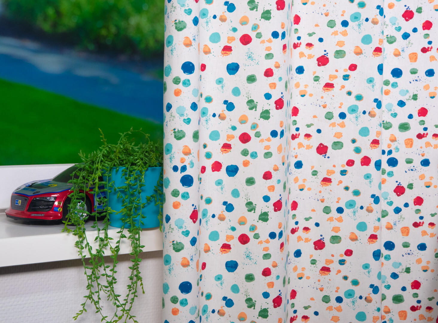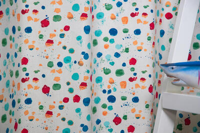 Ben je op zoek naar een tijdloos kindergordijn? Dan is dit dé goede keuze! Door de kleurrijke print is dit gordijn vrolijk en toch subtiel. De verschillende stippen lijken er als verfspatten op aangebracht te zijn. Uitstekend te combineren met een accentkleur op de muur of behang met patroon. Voor een jongen b.v. zacht oranje of jeansblauw, voor een meisjeskamer aquablauw of rood. Je kunt dit gordijn verduisterend en isolerend laten voeren of een rolgordijn kiezen. Dan kan je fijn donker slapen.