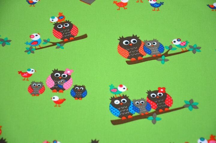 Prachtig kindergordijn met vertederende illustraties van een uilenfamilie. De katoenen gordijnstof is beschikbaar in vier felle kleuren en kunnen wij voeren en verwerken tot een verduisterend gordijn.