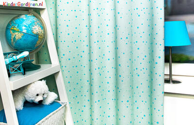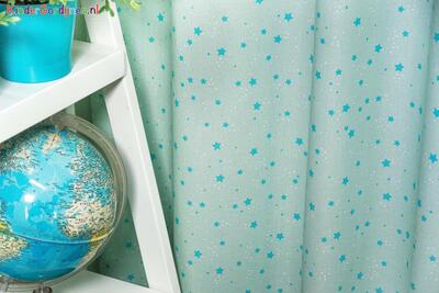 Het Starmint gordijn is een mintgroen meidjesgordijn, boordevol grote en kleine sterretjes in aqua blauw. Laat de sterretjes speciaal voor jou stralen! Een gordijn met sterretjes is uniek en tegelijkertijd tijdloos. Gemakkelijk te combineren met andere patronen in behang of beddengoed. De sterren zijn ±1cm groot en hebben een onderlinge afstand van 4-6 cm. De kleur is aan de voorzijde gedrukt. Kortom, als je op zoek bent naar een gordijn dat nooit verveelt, dan zit je met deze sterrenstof helemaal goed! Wil je de slaapkamer zo donker als de nacht? Dan kun je het gordijn extra laten voeren. Dit zorgt niet alleen voor verduistering, maar ook voor extra isolatie en voorkomt verkleuring door invloed van zonlicht. Wil je de stof eerst zelf zien en voelen? We hebben knipstalen beschikbaar die je eenvoudig kunt bestellen voordat je een op maat gemaakt gordijn koopt. Heb je vragen? Ik sta altijd klaar om te helpen. Aarzel niet om contact met mij op te nemen voor meer informatie.