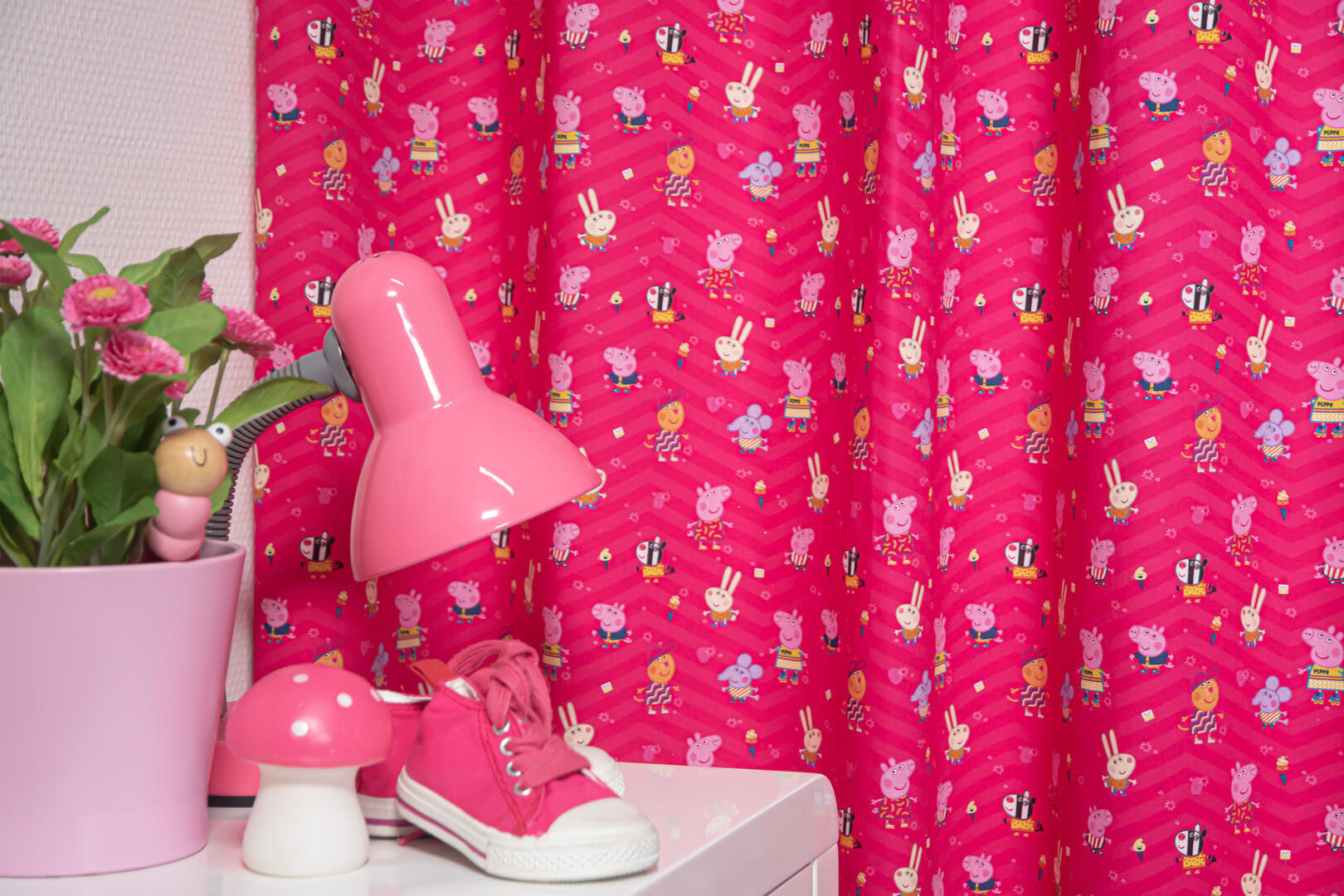 Deze gordijnstof met de naam Peppa Big is gemaakt van de beste materialen waardoor het gordijn mooi in de plooi valt.