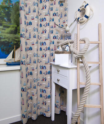 De zee roept ons van jongs af aan. Het thema Maritiem kent veel variatie. Kindergordijnen in de kleuren van een mooie zomerdag op het strand. Schelpen, vuurtorens, meeuwen, krabben, tenten en zandkastelen. Vaar door vlakken in de ruimte langs het kleurige koraal. Tover de kinderkamer om tot kajuit of piratenhol. Koers op je fantasie en je bed wordt een boot op het wijde water. Bekijk de netten op de steiger, het ruige touw en het aangespoelde hout. Keer op keer tel je de goudstukken of kijk je naar het oude handschrift in het scheepslogboek.