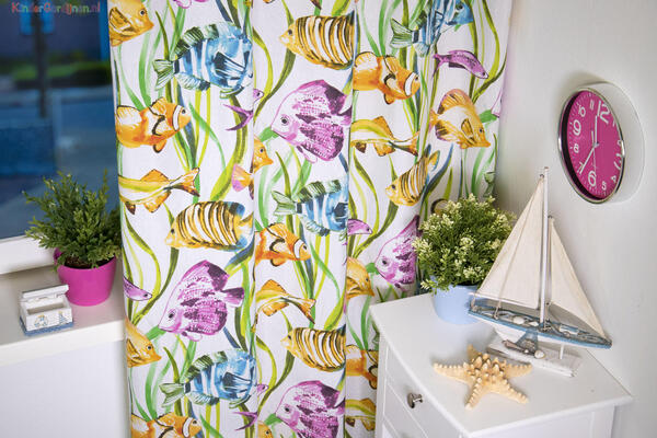 Speciaal zijn de talrijke kindergordijnen met dieren van de zee. Gordijnen met inktvissen, schildpadden of met prachtige pinguïns, walvissen, duikende dolfijnen en natuurlijk vissen groot en klein. Kijk eens naar de verschillende vismotieven, naar gordijnen met golvend koraal of kleurige zeesterren. Om schelpen te zien hoef je niet eens meer naar het strand: in je kamer hangen ze voor je raam. Veel gordijnen met zeedieren hebben een blauwe of witte achtergrond. Voor de babykamer zijn er gordijnen in zachte tinten, bijvoorbeeld met babywalvisjes. De gordijnen met lieflijke zeemeerminnen zijn een extra kijkje waard.