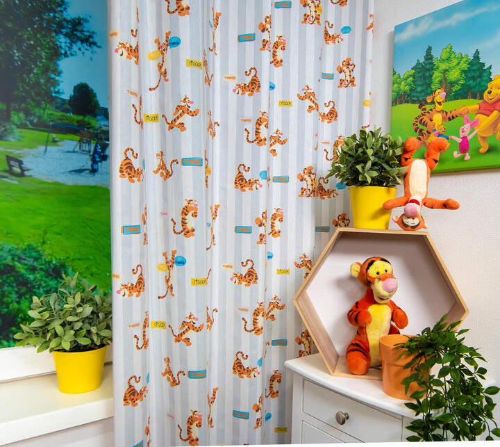 Een prachtig gordijn voor je raam! Als jij je eigen gordijnen kiest, wordt het helemaal jouw kamer. Deze gordijnstof met de naam Tijgetje is gemaakt van de beste materialen waardoor het gordijn mooi in de plooi valt. Het aantal te gebruiken banen gordijnstof van 140 cm breed wordt door ons vakkundig aan elkaar geconfectioneerd zodat het disney patroon van 64 cm mooi doorloopt. Laat voor een aangename isolatie en extra verduistering de gordijnen voeren: een verschil van dag en nacht!