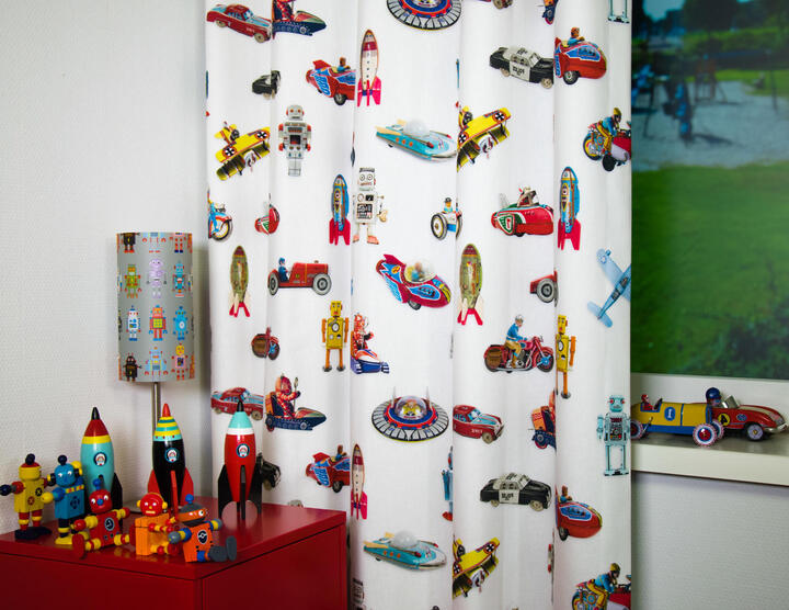 Deze gordijnstof met de naam Tin Toys is gemaakt van de beste materialen waardoor het gordijn mooi in de plooi valt.