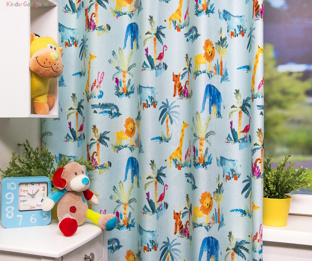 Een TOPPERTJE, dat is dit kindergordijn! Vrolijke dieren zijn afgebeeld op strelend zachte stof. De print is leverbaar in 3 ondergrondkleuren, een warm-wit, lichtblauw en donkerblauw. De safari dieren zijn met een vlotte penseel techniek als het ware geschilderd op de gordijnstof. Dat geeft een speels effect. De flamingo is 8 cm groot, de palmboom zo’n 18 cm. De achterzijde van de stof is egaal gebroken wit. Zie jij dit kindergordijn al voor je? Er is zoveel leuks op te zien en de stof kan desgewenst worden verduisterd met een verduisterende voering.