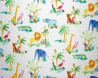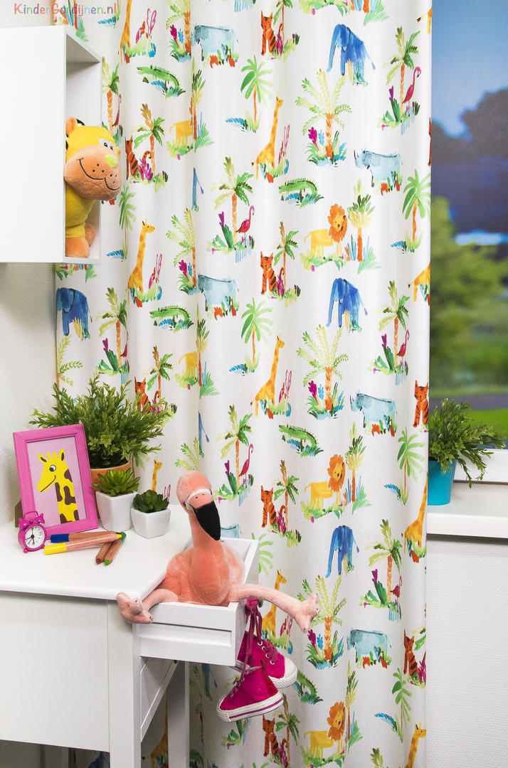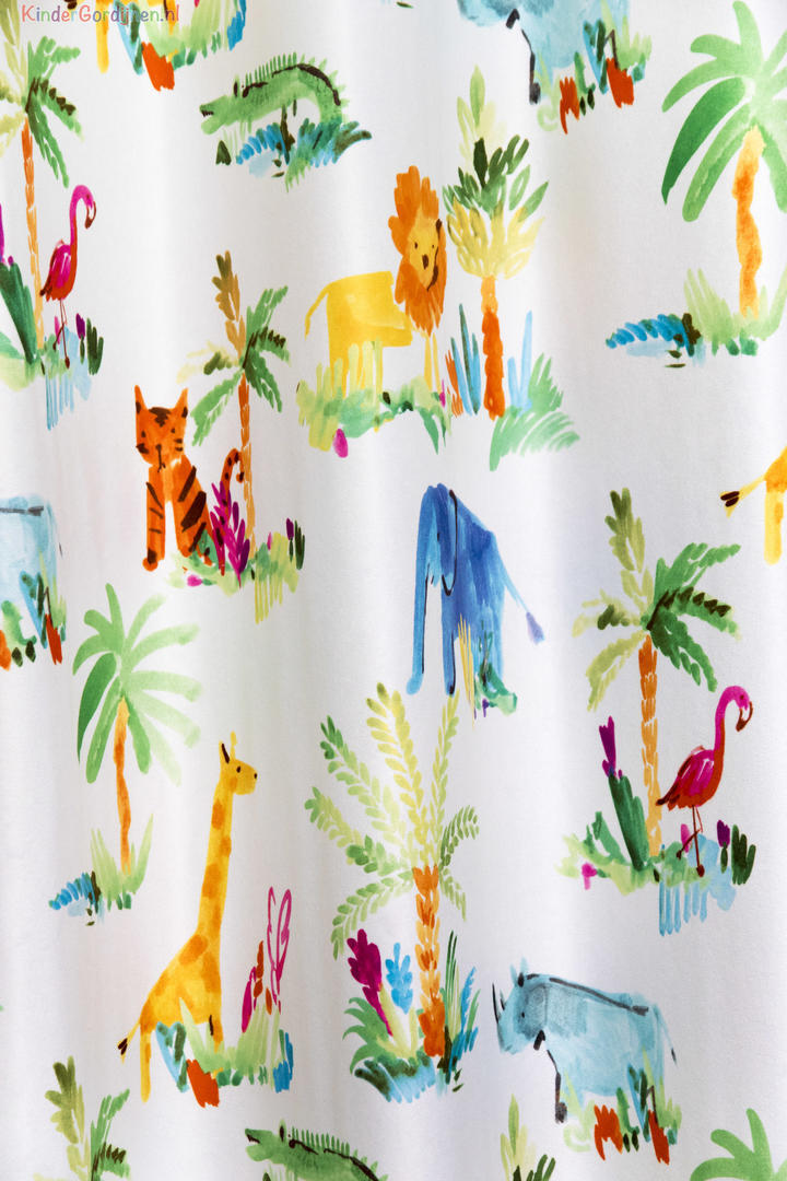 Een TOPPERTJE, dat is dit kindergordijn! Vrolijke dieren zijn afgebeeld op strelend zachte stof. De print is leverbaar in 3 ondergrondkleuren, een warm-wit, lichtblauw en donkerblauw. De safari dieren zijn met een vlotte penseel techniek als het ware geschilderd op de gordijnstof. Dat geeft een speels effect. De flamingo is 8 cm groot, de palmboom zo’n 18 cm. De achterzijde van de stof is egaal gebroken wit. Zie jij dit kindergordijn al voor je? Er is zoveel leuks op te zien en de stof kan desgewenst worden verduisterd met een verduisterende voering.