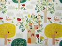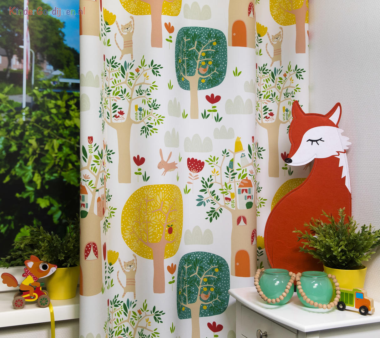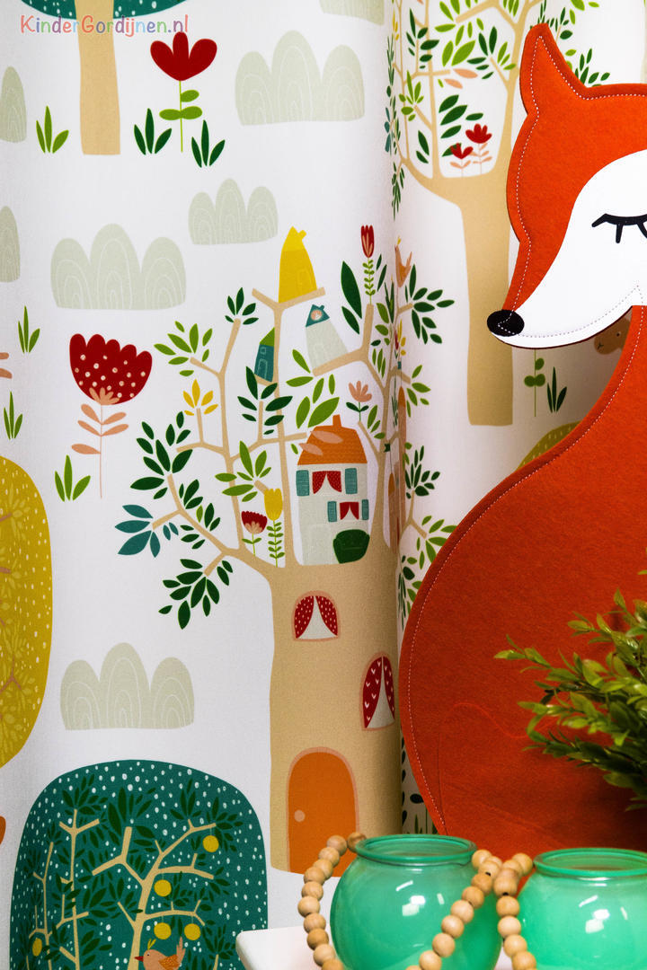 Het gordijn Treehouse brengt een levendige boswereld tot leven waarin elke centimeter iets nieuws laat zien. Tussen hoge bomen met ronde kruinen en sierlijke takken verschijnen kleine huisjes, vogels, konijntjes en nieuwsgierige eekhoorntjes. Het patroon voelt als een fantasierijk dorpje hoog tussen de boomtoppen, waar dieren wonen in boomhutten met raampjes, deurtjes en daken. Overal in het dessin zijn kleine details te vinden: blaadjes, bloemen, wolkjes en dieren die verscholen zitten tussen het groen.