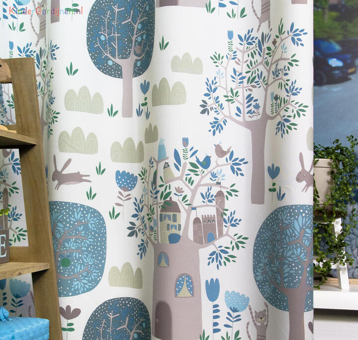 Het gordijn Treehouse brengt een levendige boswereld tot leven waarin elke centimeter iets nieuws laat zien. Tussen hoge bomen met ronde kruinen en sierlijke takken verschijnen kleine huisjes, vogels, konijntjes en nieuwsgierige eekhoorntjes. Het patroon voelt als een fantasierijk dorpje hoog tussen de boomtoppen, waar dieren wonen in boomhutten met raampjes, deurtjes en daken. Overal in het dessin zijn kleine details te vinden: blaadjes, bloemen, wolkjes en dieren die verscholen zitten tussen het groen.