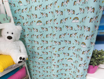 Het Unicorn Starmint is een betoverend kindergordijn voor de kamer van je kind. Dit gordijn, gemaakt van dikke katoenen stof, toont levendige eenhoornpaartjes te midden van sterretjes, edelstenen, smaragden, rode hartjes en wolken, omringd door schitterende regenbogen in bekende kleuren. Een absolute favoriet onder jonge meisjes!