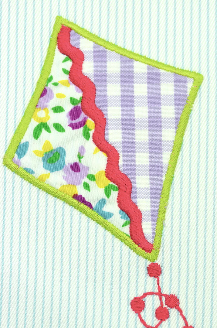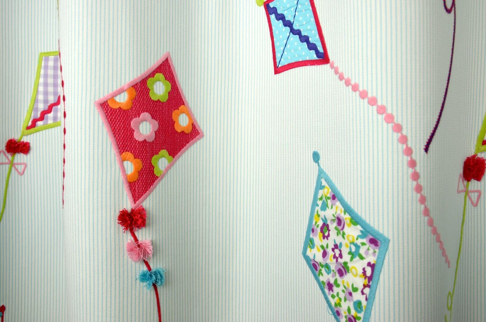 De vliegers zijn niet geprint, maar opgebouwd uit ingenaaide stukjes patroonstof die met een contrasterend stiksel zijn vastgezet. Hierdoor zijn de vormen licht verhoogd en voelbaar, wat het gordijn extra diepte geeft. Rondom elke vlieger loopt een gekleurde borduurlijn in tinten als rood, blauw, groen en roze, waardoor de vormen helder afsteken tegen de lichte achtergrond.