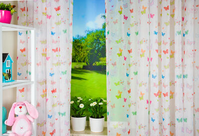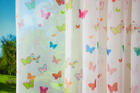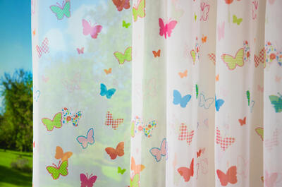 Héérlijk luchtige transparante voile, die op iedere meisjeskamer héél decoratief is. Eigenlijk “kindervitrage”. De vlinders zijn afgebeeld op de dunne, lichte ondergrond en aan beide zijden goed zichtbaar. De voile is goed tegen de inkijk, gelukkig kan je er zelf wel door naar buiten kijken. Zeker ook charmant naast een strak (verduisterend) rolgordijn. Het lijkt alsof de vlinders in je slaapkamer zweven, is dat niet een zomers gevoel?