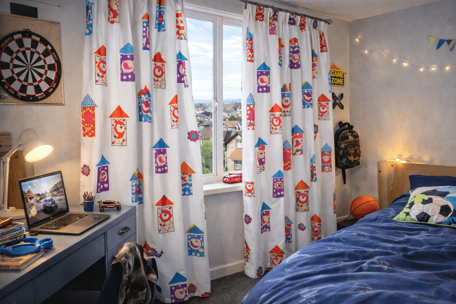 Dit unieke kindergordijn met speelse huisjes, vogeltjes en bloemen brengt leven in elke kinderkamer. De frisse kleuren en het grafische dessin maken dit gordijn perfect voor zowel jongens als meisjes – iets wat je ook terugziet in onze sfeerfoto’s, waarin we zowel een stoere jongenskamer als een gezellige meisjeskamer hebben ingericht met ditzelfde gordijn. Het resultaat? Een veelzijdige, warme uitstraling die zich moeiteloos aanpast aan iedere stijl en leeftijd.