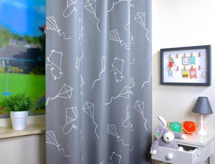 Dit is ons kindergordijn Kite, een ware eyecatcher voor elke kinderkamer! De vrolijke vliegers, gedrukt op een subtiele matte grijze kleur, brengen een speels en levendig element in de kamer. Bovendien is dit gordijn verkrijgbaar met een mat witte onderkleur met vliegers met een prachtige, gevarieerde kleurstellingen die ongetwijfeld de aandacht zal trekken. Met een flinke vlieger, inclusief staart van maar liefst 25 cm lang, maakt dit royale patroon het mogelijk om het gordijn prachtig tot op de grond te laten vallen. De stevige, sportieve stof kan zelfs van een verduisterende voering worden voorzien, waardoor het zowel stijlvol als functioneel is. Laat je verbeelding de vrije loop en geniet van heerlijke dromen onder dit unieke kindergordijn!