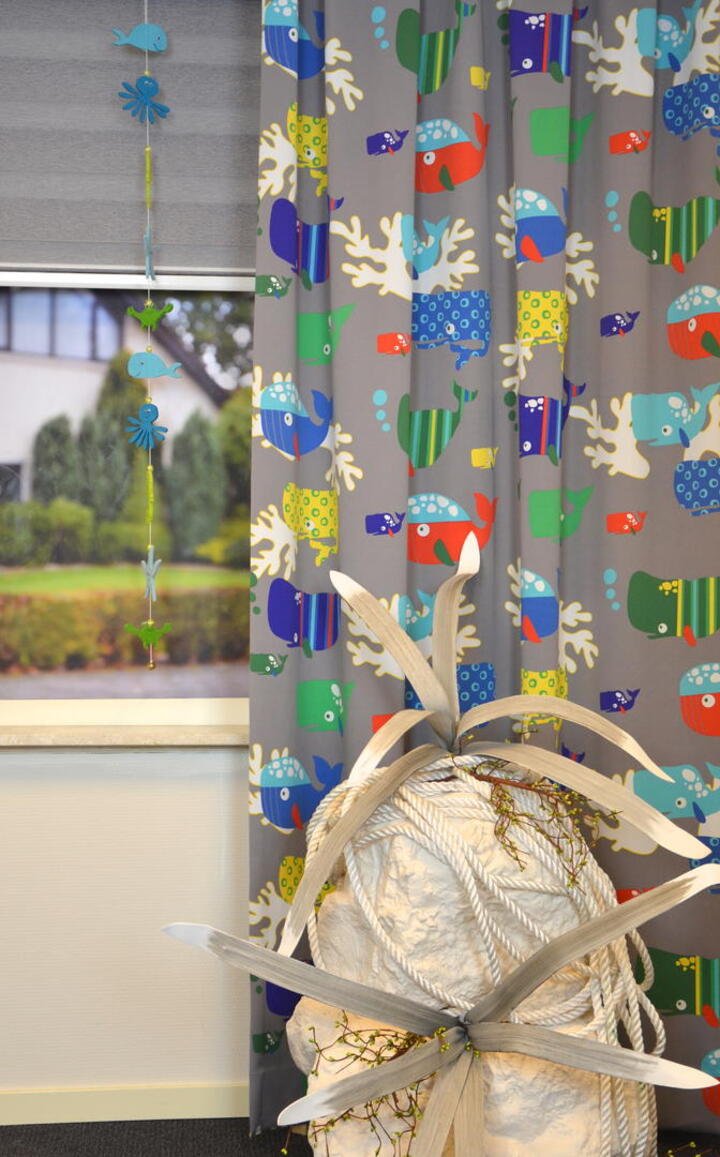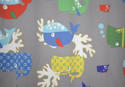 Verduisterende gordijnstof met kleurrijke print van walvissen op de voorzijde en een klein motiefje aan de achterzijde. Ideale gordijnen voor een kinderkamer.