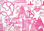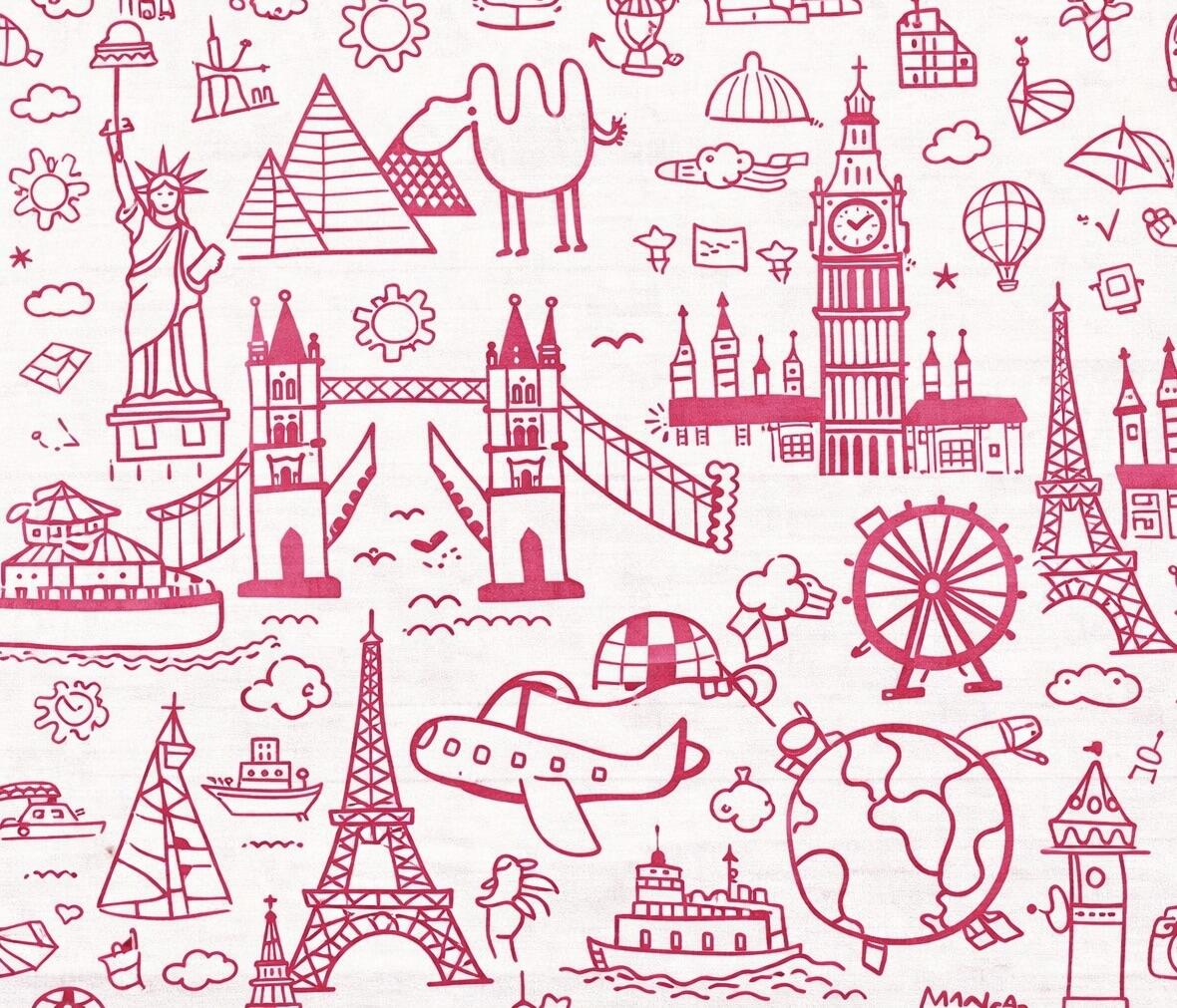 Het patroon zit vol herkenbare en leuke afbeeldingen uit de hele wereld. Je ziet onder andere de Eiffeltoren, de Big Ben-klokkentoren, de London Eye, de Tower Bridge en het Vrijheidsbeeld. Daarnaast staan er wereldbollen, luchtballonnen, boten en vliegtuigen tussen, aangevuld met kleine wolkjes, sterretjes, envelopjes en vrolijke figuurtjes.
