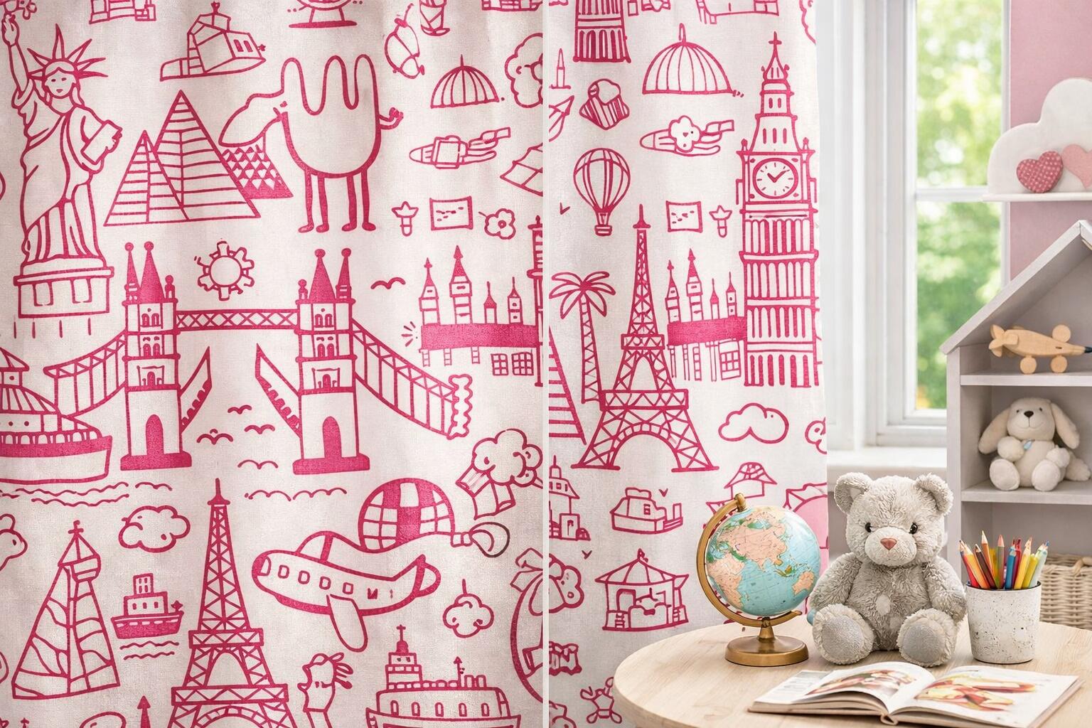 Gordijn World is een vrolijk en fantasierijk gordijn dat speciaal past in een meisjeskamer. Het speelse wereldthema nodigt uit tot kijken, dromen en verhalen verzinnen. Over de hele stof zijn handgetekende illustraties verspreid in een frisse roze kleur op een lichte, zacht gebroken witte achtergrond. Dankzij deze combinatie oogt het gordijn licht en vriendelijk, terwijl het dessin toch duidelijk aanwezig blijft.